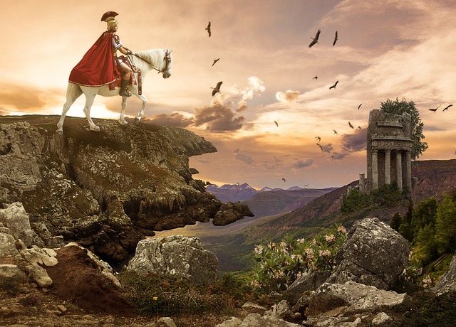 馬に乗り、兵を率いています。崖の一本道を緊張しながら。
